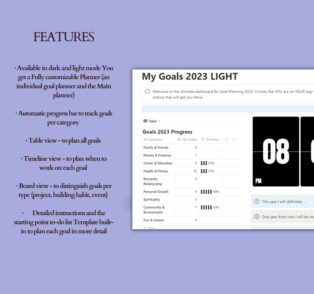 - Available in dark and light mode You get a Fully customizable Planner (an individual goal planner and the Main planner)